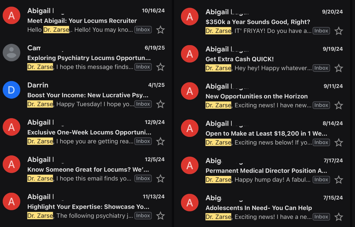 Since 2021, I have received recruiting communications for a psychiatrist who shares my name: emails, voicemails, texts. I stopped counting. I was laid off the year they started arriving.