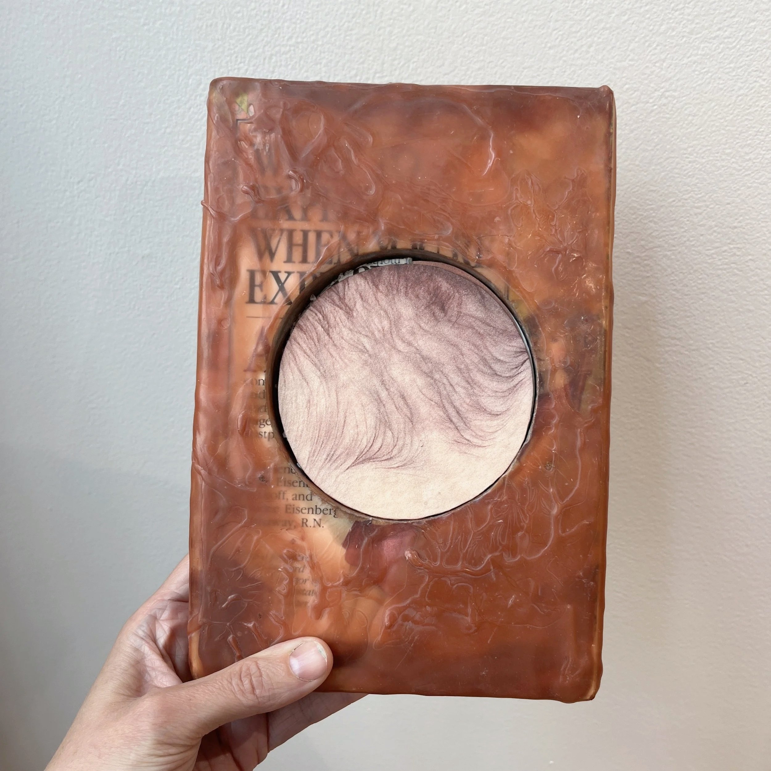 A wax-encased original copy of What to Expect is cut with an opening of exactly 10 centimeters, the dilation of the cervix at full birth. The aperture is both anatomical fact and conceptual argument: a tactile void where the guide offers only prescription.